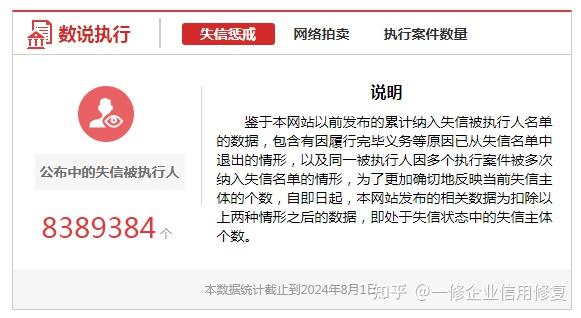 咱先看一组数据,根据“中国执行信息公共网”公布数据显示,截止2024年8月1日,全国仍处于失信状态的失信主体个数为8389384个,这个数据每天都在更新,有兴趣的朋友可以自行查看。