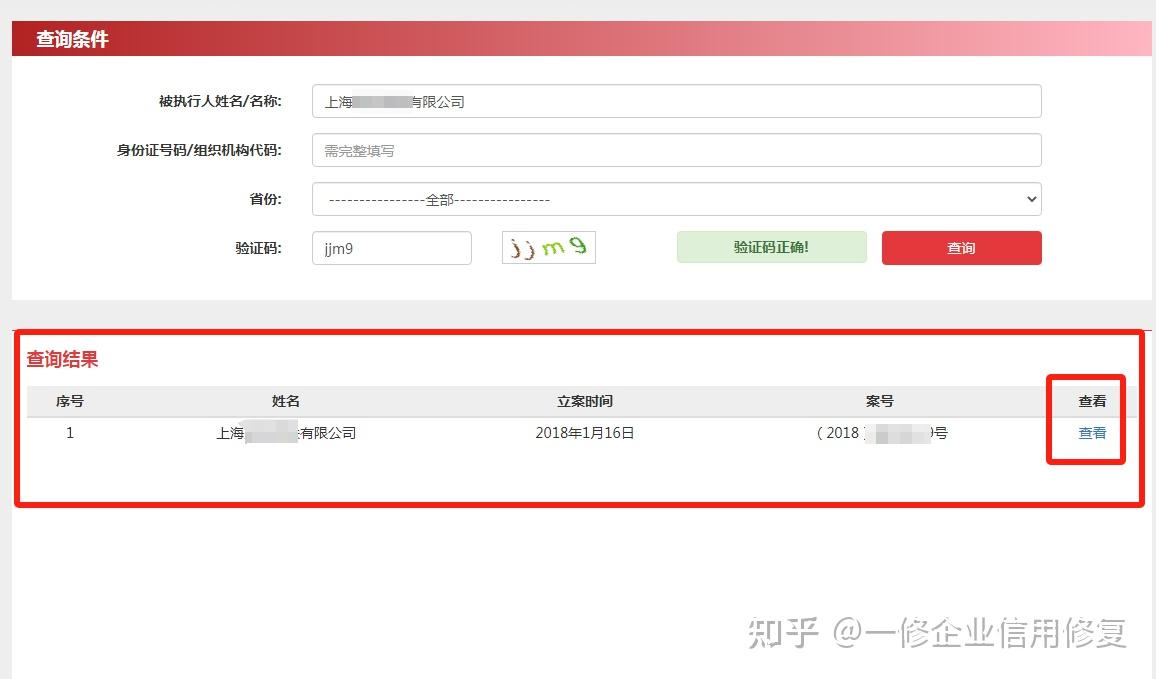 3.输入信息后,查询结果如下图。点击右侧“查看”按钮,看查看法院限制令详情。