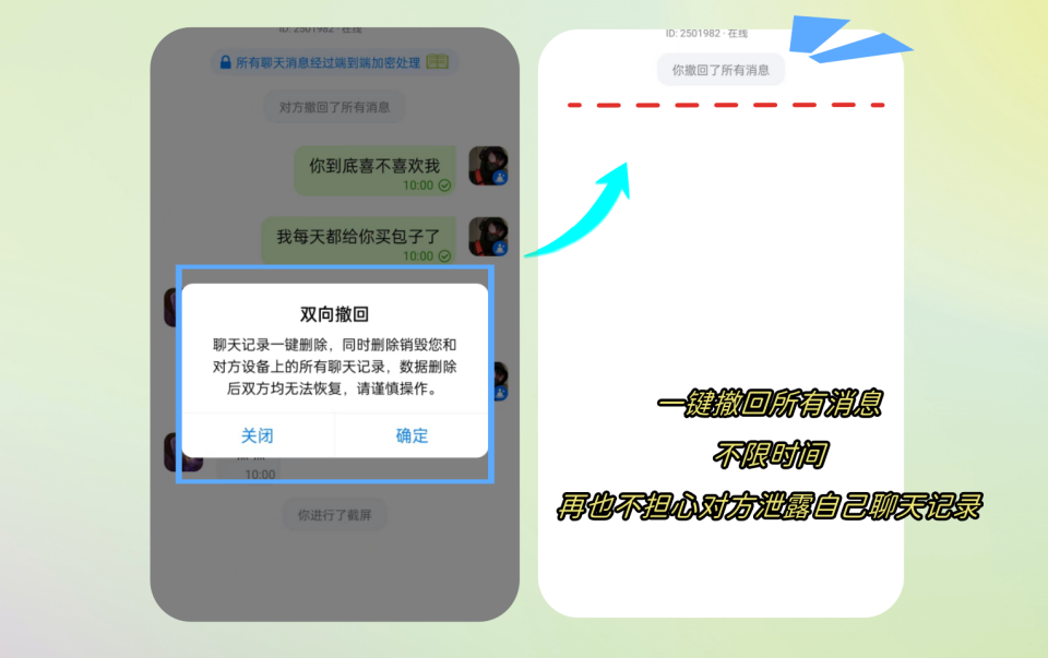 同时这些软件还设置了各种加密功能,用户可以结合使用,不担心对方泄露自己信息。如双方撤回:一键撤回双方所有消息,对方的也撤回,撤回后无法恢复。