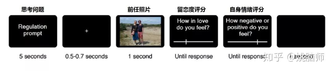 作者招募了24名因失恋而痛苦不已的志愿者来做一个“爱情调控”实验。在每轮实验中,被试人先要根据提示思考一个问题(5秒),然后观看他们前任的照片(1秒),然后对自己的留恋程度和情绪情况进行打分(如下图)。在实验过程中,被试者的脑电活动也被记录了下来。