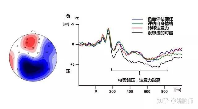作者接着分析了被试观看前任照片时的脑电活动,发现【负面评估前任】、【评估自身情绪】和【转移注意力】都降低了被试对前任的注意力(与对照相比),但是降低的程度没有显著区别。