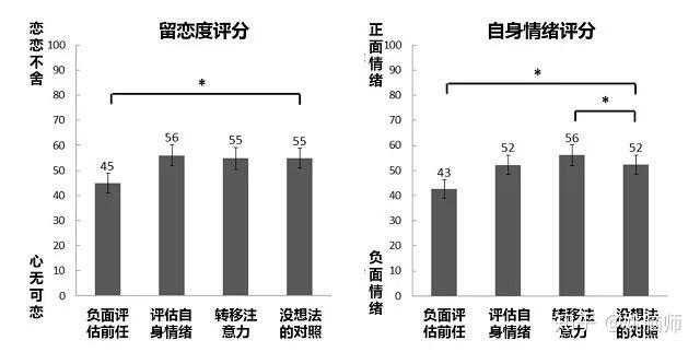 他们分析了被试的留恋度评分后发现,跟【没想法的对照组】比起来,【评估自身情绪】或是【转移注意力】都不能降低对前任的留恋程度,只有【负面评估前任】显著地降低了留恋度。