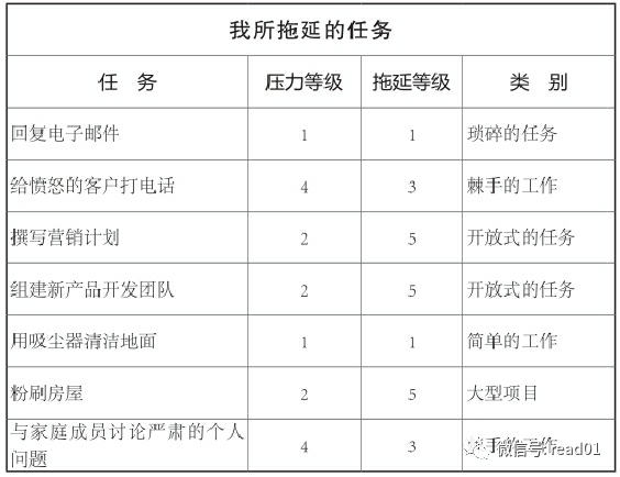 在第一列记录所拖延的任务,在第二列中按照从1到5划分压力等级(1代表压力很小或没有压力;5代表压力巨大),在第三列中同样按照从1到5评估拖延等级,在最后一列中添加如下类别,当然,你也可以有自己的考量。